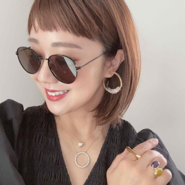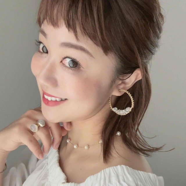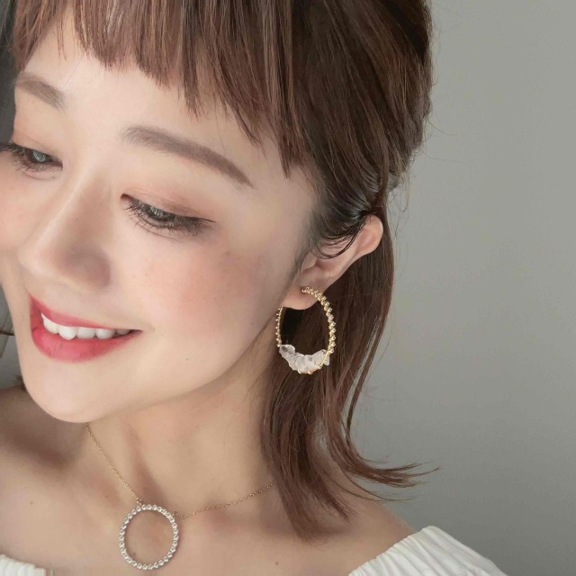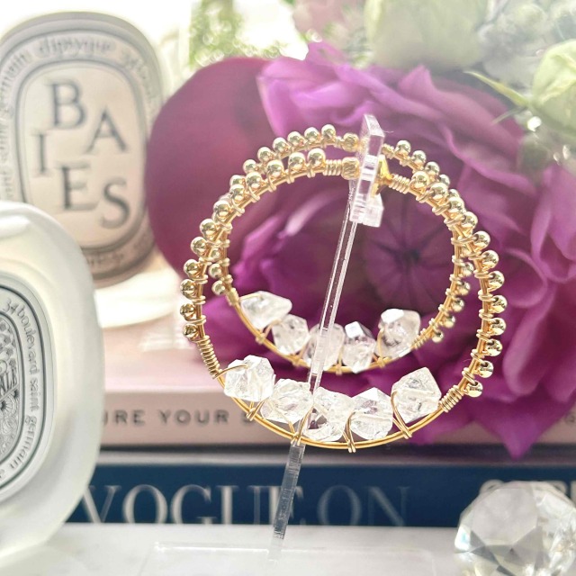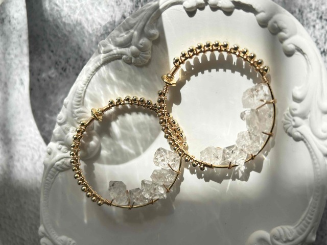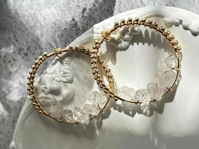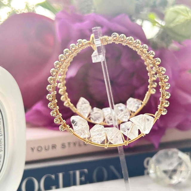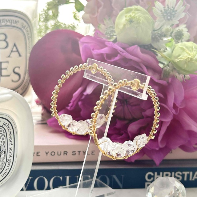 ミドルサイズのフープと組み合わせ、周りに極小メタルボールを巻き付けクリスタルをより輝かせる様なデザインにしております。