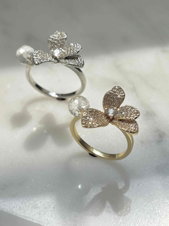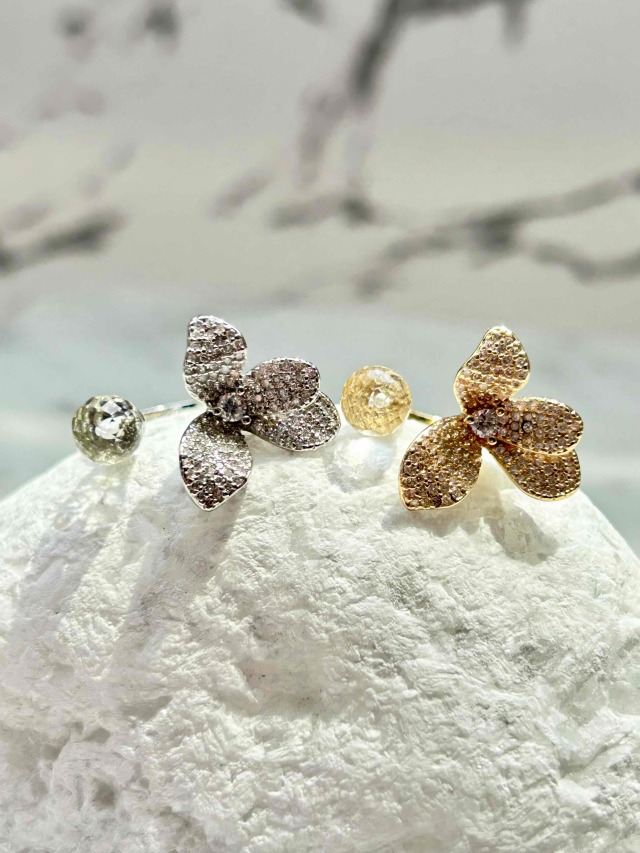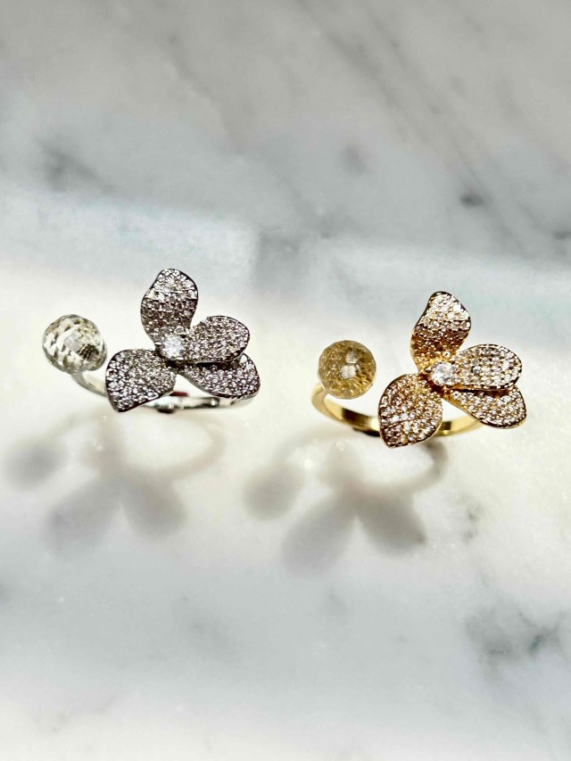 透明度の高いカッティングが非常に美しい高品質のCRYSTALと蘭の花のモチーフのオープンリングです。