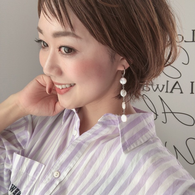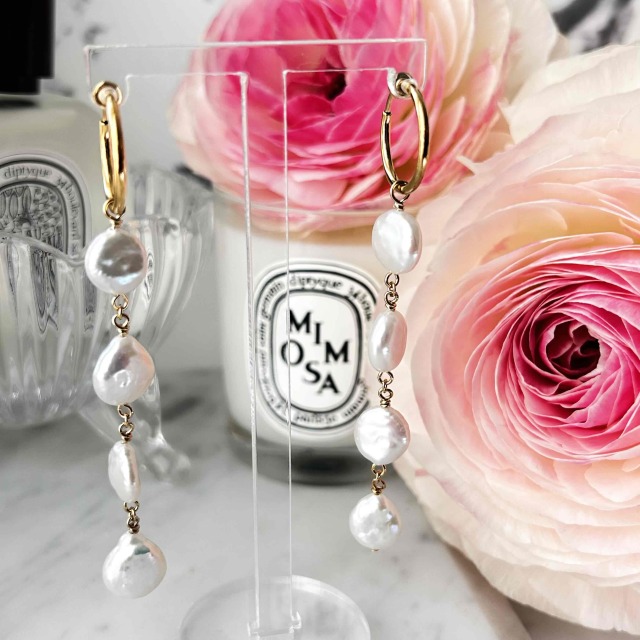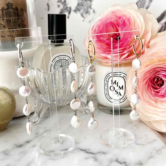 約10㎜のコインパールが顔周りで揺れるのでレフ板効果の様に華やぎ、明るい印象に…