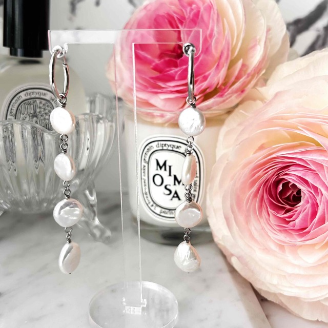 コイン型の淡水パールがゆらゆら揺れるフープイヤリングです。