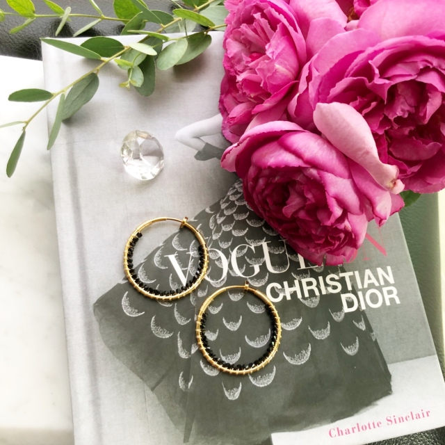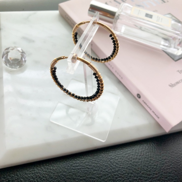 40mmのミドルサイズのフープイヤリングの内側に極小ブラッククリスタルストーンを贅沢に巻き付けたフープイヤリングです。