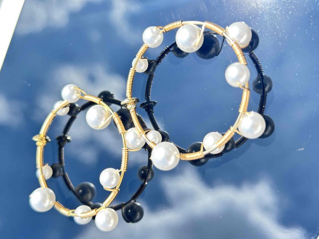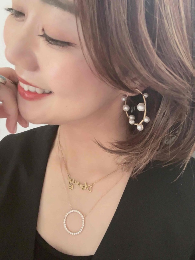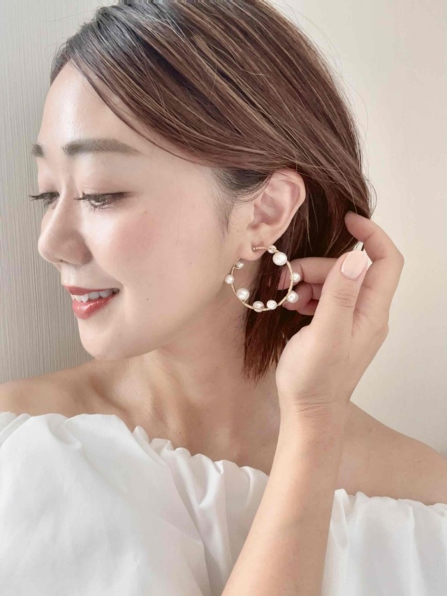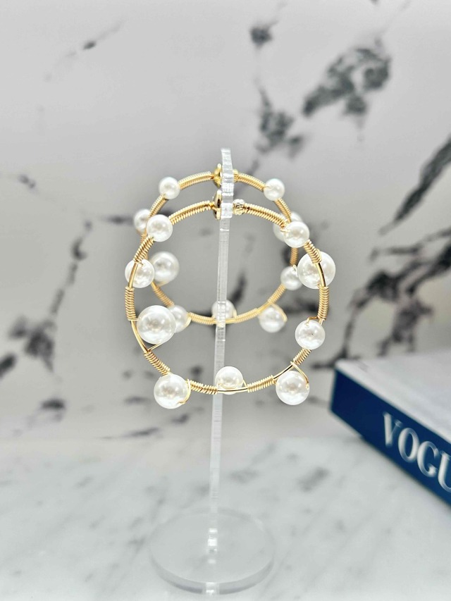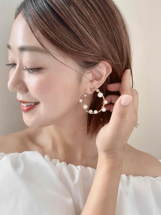 華奢ラインのミドルフープイヤリングにサイズ違いのパールを色んなところにセットした、どこから見ても可愛いオシャレなパールフープイヤリングです。