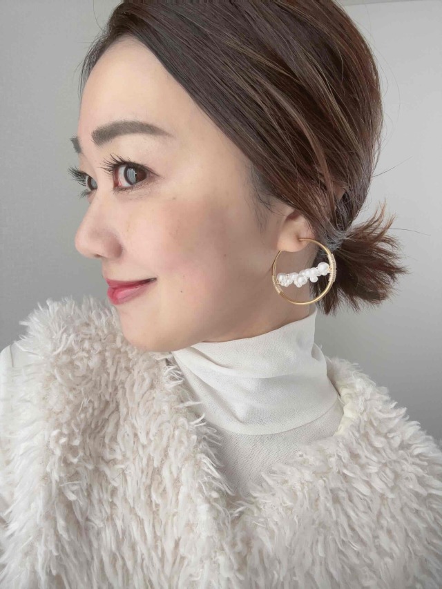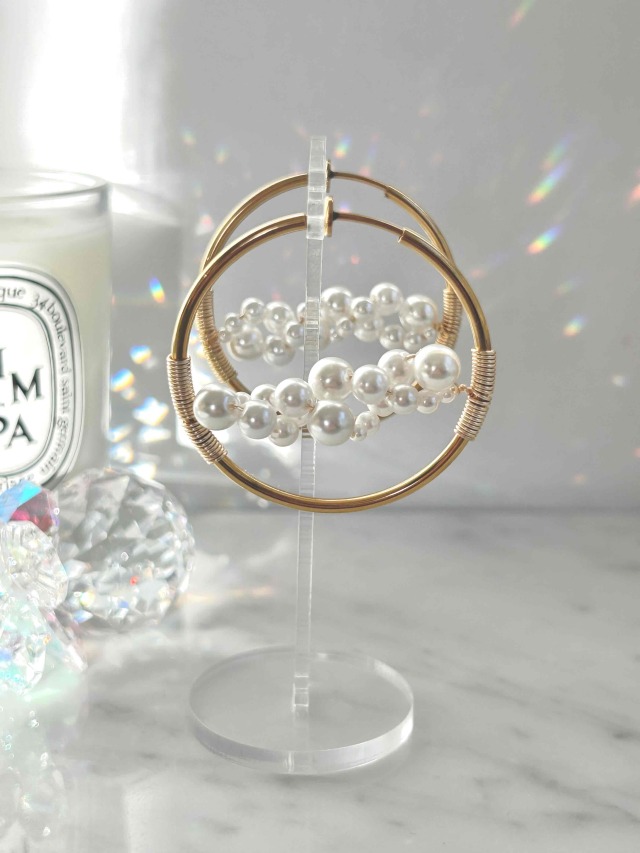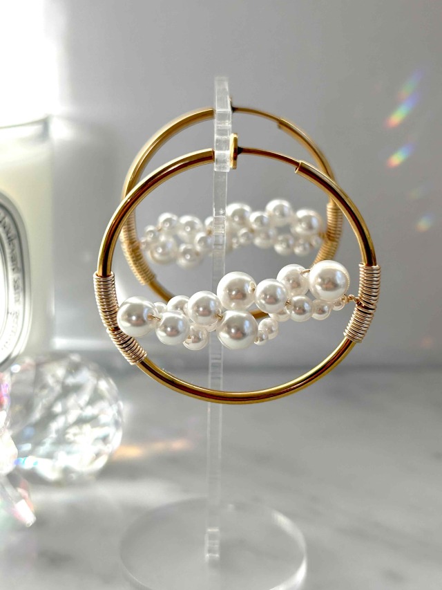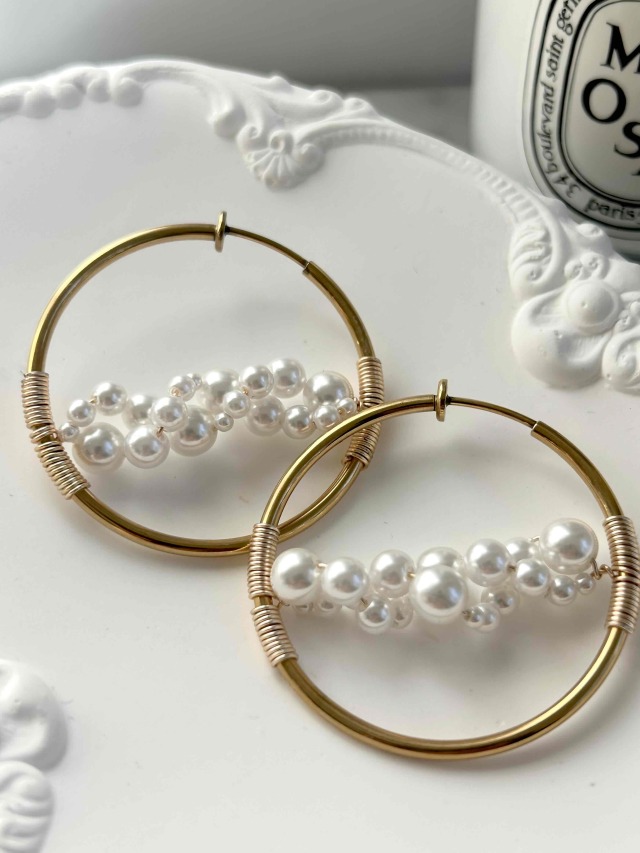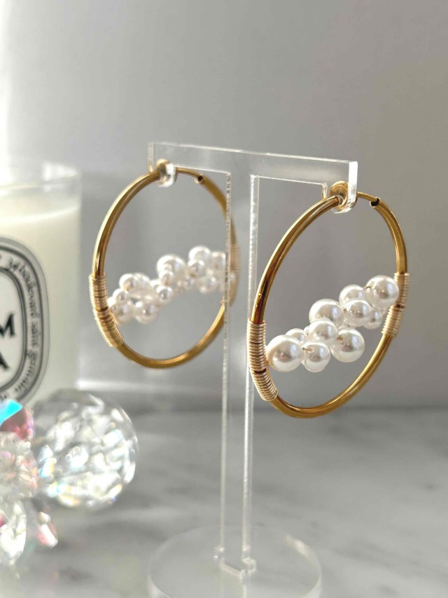 まるで光をすくい上げた様に艶めくパール達が耳元でさりげなく存在感を放つフープイヤリングです。