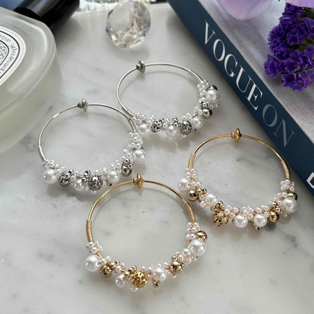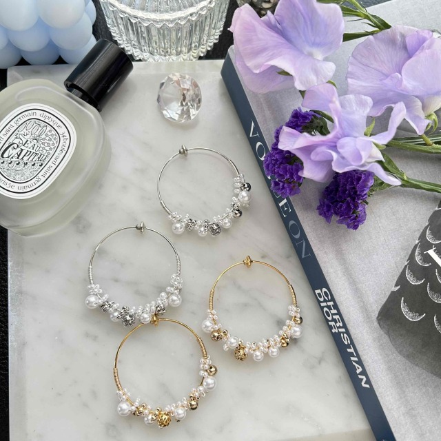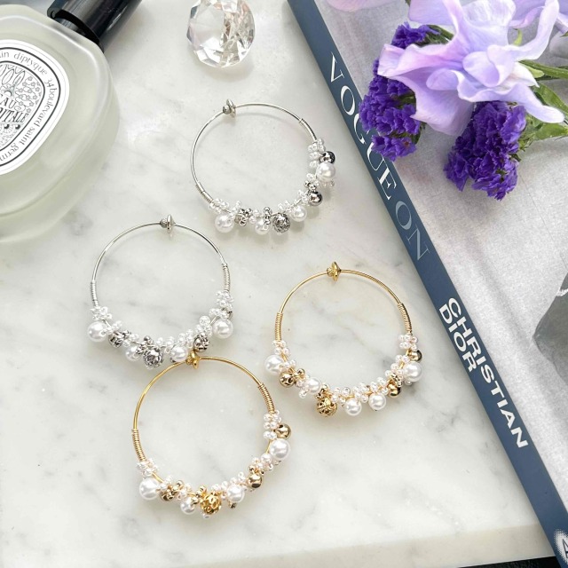華奢なラインのフープイヤリングにパールとメタルボールや透かしノールを丁寧に巻き付けたフープイヤリングです。