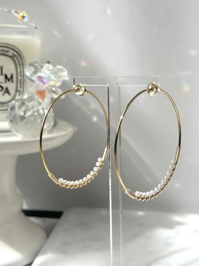 華奢大きめフープと小粒パールのイヤリング